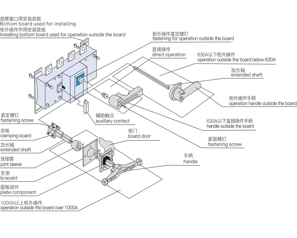 多種結(jié)構(gòu)與操作方式,有直接觀察觸頭通斷狀態(tài)的窗口,有柜內(nèi)、柜外、柜后操作,有正面、側(cè)面操作,有板后接線。